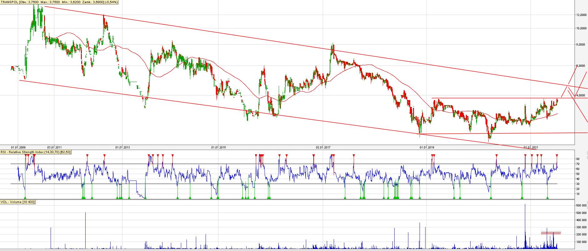 Kurs akcji od ponad 11 lat porusza się w kanale spadkowym przez co należy uznać, iż na akacjach mamy wieloletnią bessę. Jak wiadomo bessy nie trwają wiecznie i w mojej ocenie są pierwsze jaskółki wskazujące na próby zmian tego stanu. Poprawy odzwierciedlenia w notowaniach kursu akcji upatruje w poprawie sytuacji finansowej spółki. Jeśli przyjrzeć się właśnie finansom to od 4 lat następuje poprawa wyników, gdzie zysk firmy za ostatnie 4 kwartały jest rekordowy. Uwagę należy też zwrócić na zwiększony volumen obrotu akcjami który może sugerować, iż poziomy z ostatniego roku są atrakcyjne dla większej ilości inwestorów. Takim magnesem który zwiększył zainteresowanie akcjami może być wypłata dywidendy gdzie dniem uprawniającym do jej otrzymania będzie 12 sierpnia 2021 a wypłata nastąpi 26 sierpnia 2021 roku. Stopa dywidendy jest zadowalająca i wynosi 7.34 %.